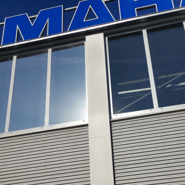 Moderne Glasfassade eines Bürogebäudes in Geretsried mit maßgeschneiderter Flachglas-Sonnenschutzfolie für effektiven Hitzeschutz und UV-Schutz von c&w – das Werbezentrum.